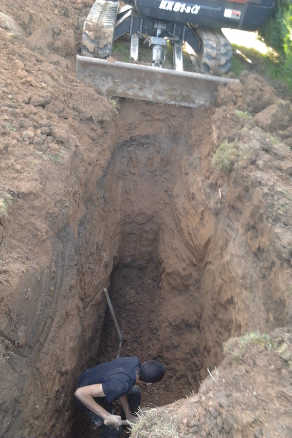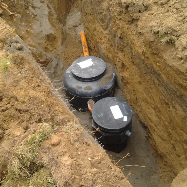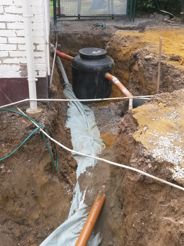 Pose de citerne d'eau de pluie, fosses-sceptique, dégraisseur, station d'épuration, chambre de relevage, travaux de drainage, puits perdus, drain de dispersion, placement de chambre de visite, caniveaux, …